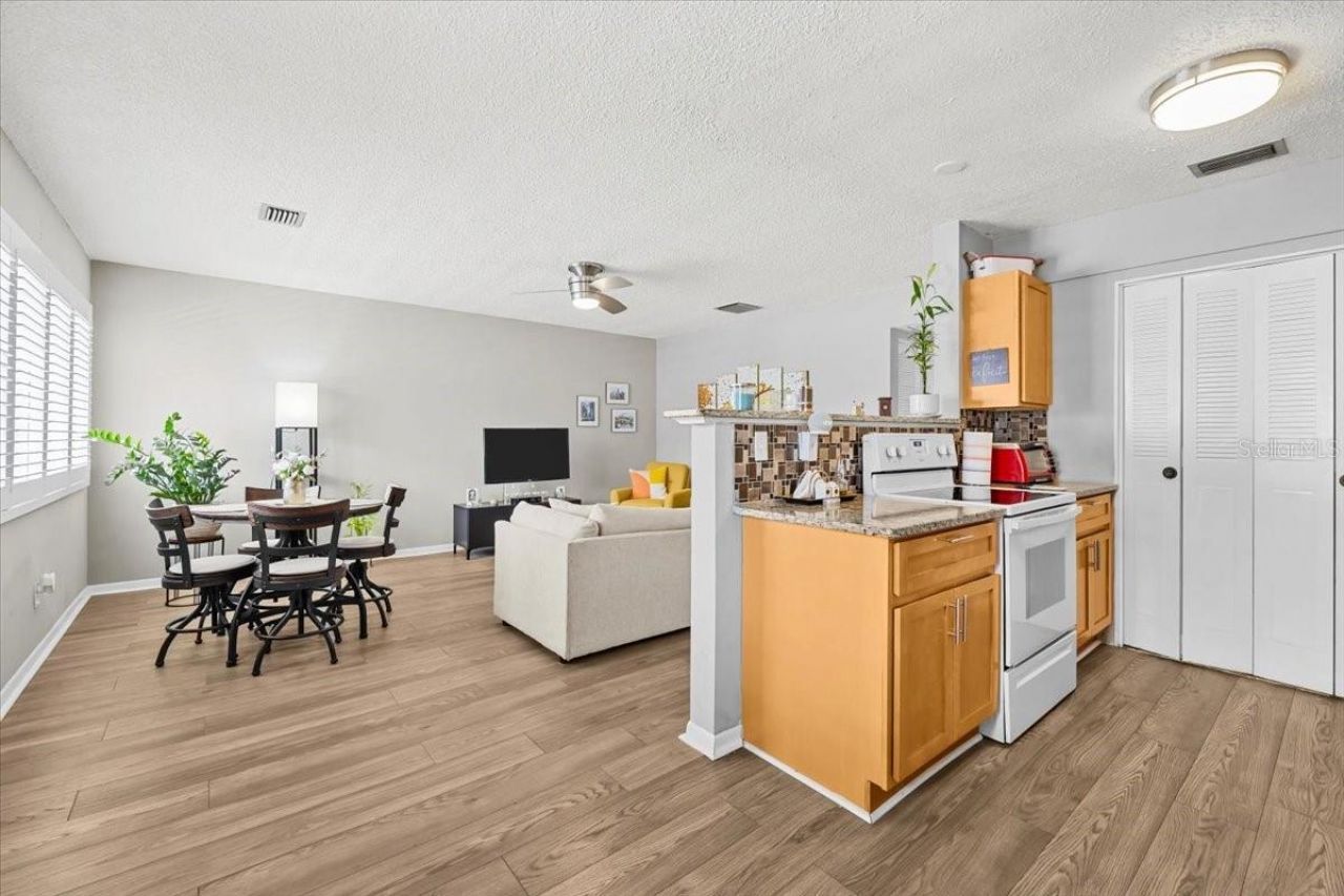 1235 S Highland Ave, Unit 2-307, Clearwater, FL 33756. Move right in to this beautifully maintained, 2-bedroom, 1-bath condominium located in the highly desirable Kalmia 55+ Community in Clearwater. This spacious unit features updated wood laminate flooring, elegant plantation shutters, and updated ceiling fans, creating a bright and comfortable living space. The kitchen offers shaker-style cabinetry, granite countertops, pantry storage, and a convenient eat-in area, perfect for everyday living. Both bedrooms are generously sized and feature super large walk-in closets, providing plenty of storage. The modern updated bathroom includes recessed lighting and stylish finishes, giving the space a fresh and contemporary feel. Additional updates provide peace of mind, including a new roof (2025). The unit also includes assigned covered parking, elevator access, and additional storage. Residents enjoy a wide range of amenities including a heated pool, shuffleboard, laundry facilities, and beautifully maintained grounds. The clubhouse is perfect for entertaining, featuring a full kitchen and two full-size pool tables, making it an ideal space to gather with friends and neighbors. Low HOA fees cover cable, internet, water, sewer, trash, exterior maintenance, insurance, and all community amenities, offering excellent value. Conveniently located just minutes from Clearwater's world-famous beaches, airports, shopping, restaurants, and medical facilities, this Condo provides the perfect opportunity to enjoy a comfortable and relaxed Florida lifestyle.