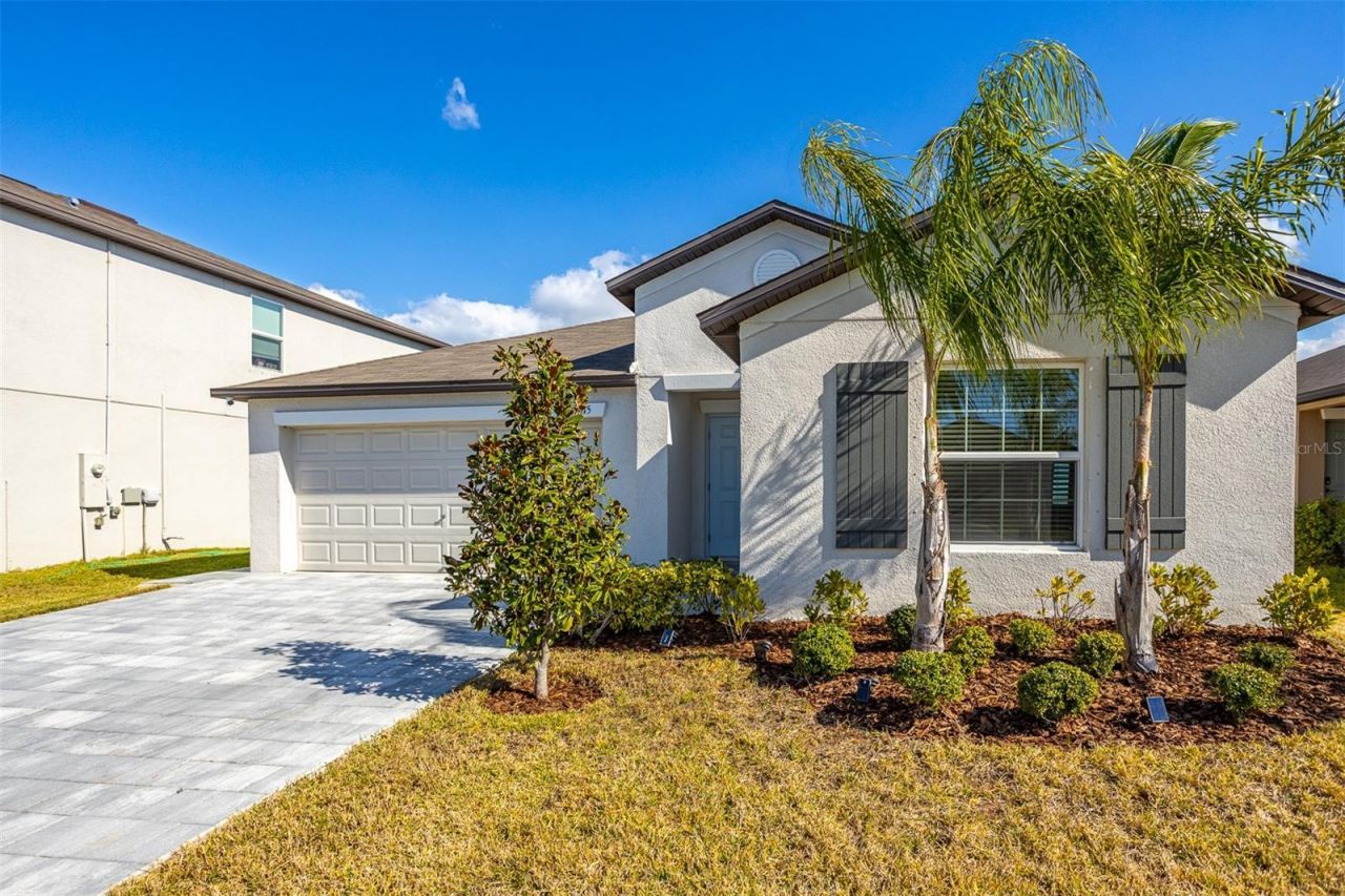 Welcome to this beautifully maintained, move-in-ready single-story home offering modern finishes, thoughtful design, and inviting Florida curb appeal. From the moment you arrive, the home makes a strong first impression with a paver driveway, manicured landscaping, decorative shutters, and palm trees that create a polished and welcoming exterior.A welcoming foyer with designer lighting sets the tone as you enter, leading into a bright, open-concept living space designed for both everyday comfort and entertaining. The main living areas feature tile flooring, high ceilings, recessed lighting, and abundant natural light, creating a clean and airy atmosphere throughout the home. The dining area is enhanced by a striking accent feature wall, adding visual interest and a designer touch to the space.The kitchen is both stylish and functional, offering white cabinetry, granite countertops, stainless steel appliances, a spacious center island with bar seating, modern pendant lighting, and a large walk-in pantry-ideal for hosting gatherings or casual meals.The owner's suite provides a comfortable private retreat, complete with generous space and an ensuite bathroom featuring granite countertops, a walk-in shower, and a large walk-in closet conveniently located within the bathroom. Secondary bedrooms are well-sized and versatile, while an additional flex space offers the perfect setup for a home office, guest room, or creative workspace.Step outside to the backyard, where a rear fence provides privacy and an extended paver patio creates the ideal setting for outdoor dining, relaxing, or entertaining. The open side yards maintain a spacious feel while allowing flexibility for future personalization.Additional highlights include cohesive modern finishes throughout, a dedicated laundry area, and a layout that maximizes functionality and flow. Meticulously cared for and truly move-in ready, this home delivers modern comfort, thoughtful design, and effortless living in a desirable community.