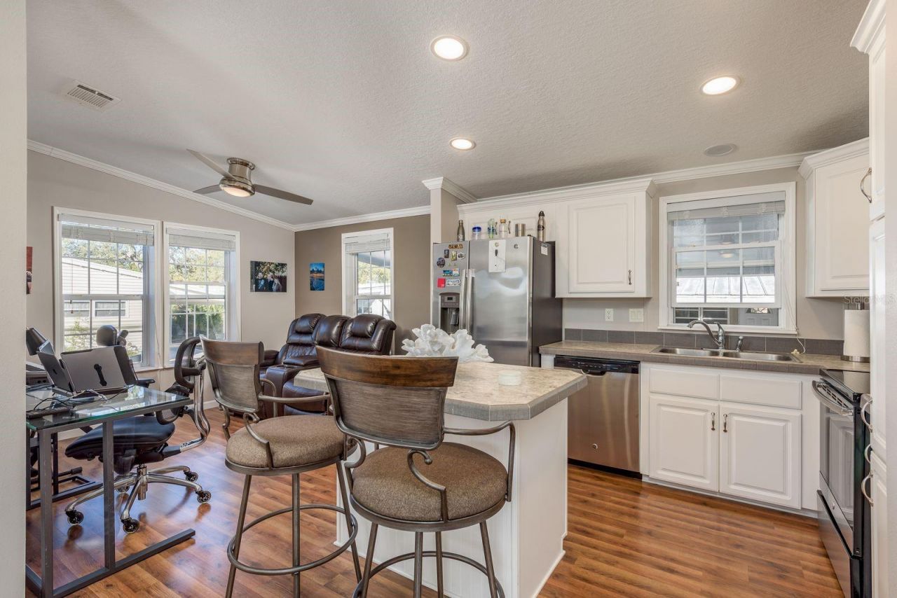 Experience relaxed Florida living in this Jacobson built manufactured home situated in South Gate, a resident-owned 55+ community in Clearwater. The neighborhood offers off-street parking, a clubhouse, a geothermal heated swimming pool, and recreational amenities such as bocce and shuffleboard courts. Planned social activities and on-site management create a friendly atmosphere.Inside, the home offers an open-concept layout with two comfortable bedrooms and two full bathrooms. Plenty of windows invite natural light, and the spacious living area flows easily. Enjoy stainless steel appliances and an island in the kitchen. Laminate flooring and neutral wall colors complement the warm feeling. You will enjoy Florida's warm weather on your screened porch or carport lanai. Owners benefit from recent construction standards based on the 2017 manufacture date. This home has just under 1000 sq ft of living space. 2020 HVAC system, updated ceiling fans, enhance comfort, and a gutter system with a transferable leaf-filter keeps maintenance low. Regular pest treatments and a water softener system add to the worry-free lifestyle. South Gate is centrally located in Clearwater. This community is just a few minutes from world famous Clearwater Beach and has easy access to two international airports all within a 30-minute drive.Baseball fans will love that the area hosts major league spring training: the Philadelphia Phillies train in Clearwater, and the Toronto Blue Jays train in neighboring Dunedin, while other teams (such as the Tampa Bay Rays) are within a short drive.South Gate is designed for easy living. The co-op keeps monthly costs predictable with a $250 HOA fee that covers water, sewer, and trash service, lawn care, and escrow reserves. It also grants access to the community amenities. A $48,000 cooperative share/land value is included in the purchase price, giving you an ownership stake in this amenity-rich neighborhood and more time to enjoy sunny days by the pool, socializing at the clubhouse, or exploring nearby beaches and attractions.Don't let this one slip through your fingers. Call to schedule your home tour today.