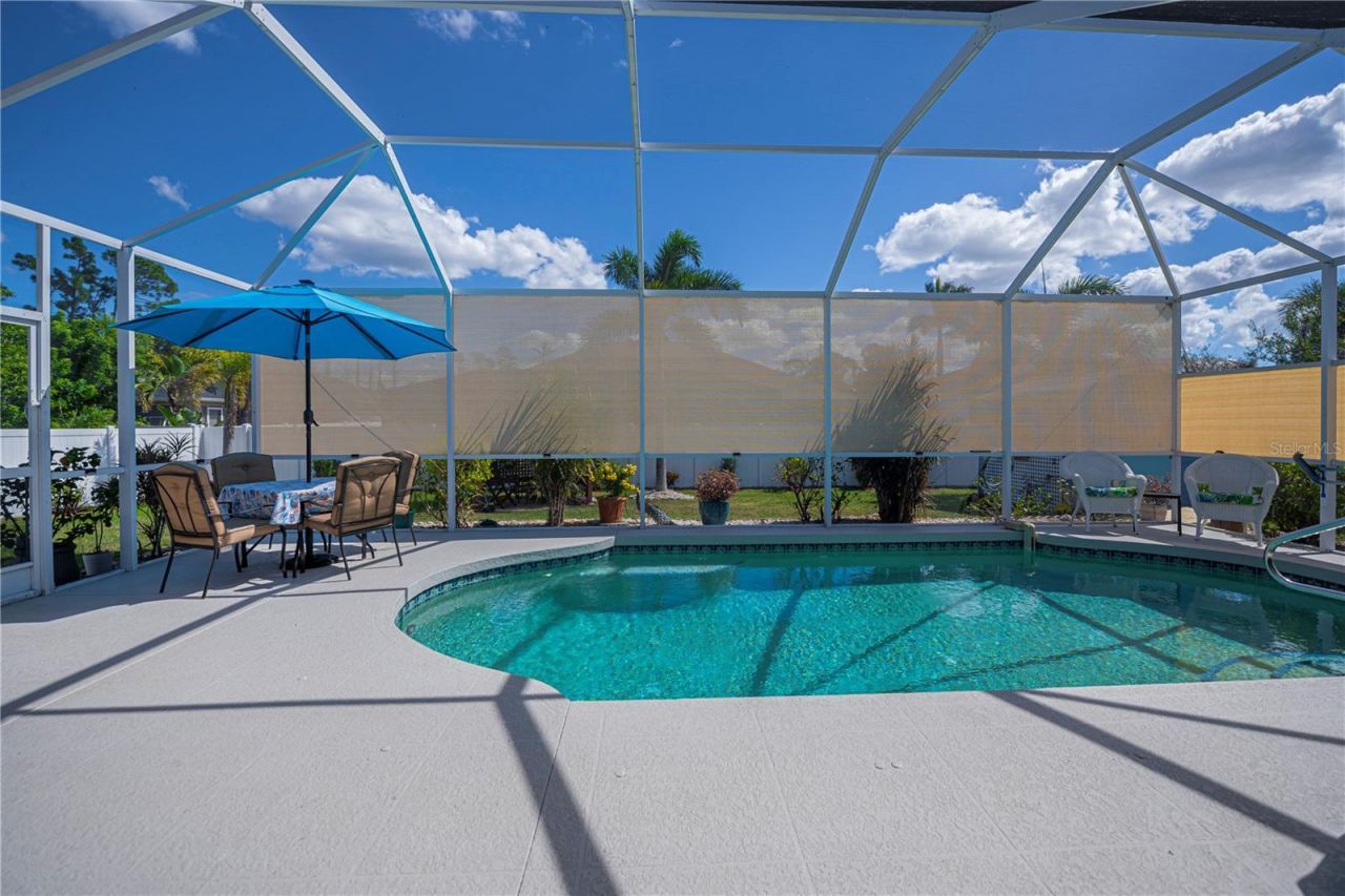 Prepare to be WOWED by this ABSOLUTELY STUNNING 3-bedroom, 2-bathroom, 2-car garage POOL HOME in North Port! The ultimate backyard SHOWSTOPPER awaits you-a one-of-a-kind POOLSIDE TIKI BAR that's perfect for unforgettable parties and fun-filled weekends with friends and family!This beautifully updated home not only screams style but also delivers AMAZING SOLAR SAVINGS, along with custom decorator touches throughout that make it truly one of a kind. PRICE IMPROVEMENT ALERT! Step inside through a warm and inviting entryway to discover elegant ceramic plank tile flooring, rounded corners, and stunning sunburst windows that flood the space with natural light-all within a fully fenced private yard for your ultimate peace and privacy.CALLING ALL CHEFS! The gourmet kitchen is a dream come true featuring pristine white shaker cabinets with soft-close doors and drawers, a trendy subway tile backsplash, gorgeous granite countertops, a massive pantry, and a convenient island with top-of-the-line appliances ready for your culinary creations.The expansive living room and separate dining area, enhanced with stylish custom accents, create the perfect setting for entertaining and making memories with loved ones.Your luxurious master suite is a true retreat, with private patio and pool access, a spacious walk-in closet, and a beautifully updated ensuite boasting dual sinks, granite vanities, and a private commode. Guest bedrooms are generously sized and share a modern, beautifully updated bathroom.Step outside to your oversized, sparkling private pool surrounded by a generous sundeck ideal for soaking up the sun, a large covered patio for shaded relaxation, and that jaw-dropping custom tiki-style outdoor wet bar-this backyard is truly an entertainer's paradise! Garden enthusiasts will fall in love with the pergola misting system, designed to nurture orchids and create a peaceful outdoor oasis.Additional standout features include:*New 2023 no-see-um screening and modern ceiling fans*Brand new 2025 A/C system*Recent property survey for your peace of mind*Public water & septic (2013)*Smart 8-zone sprinkler system with Bluetooth technology (2020)*Inside laundry with extra storage cabinetry*Miami-Dade Kevlar hurricane protection*29 solar panels delivering instant solar equity with an assumable lease of 18 panels at $130/month and an estimated electric bill of only $30 for buyers after sellers pay off the remaining owned ones at closing!*Garage with sliding screened doors for airflow and privacy*8x10 outdoor shed with electricity and water-perfect for hobbies or extra storage*No HOA fees and no flood insurance required!Perfectly located near Myakka State Park and Myakkahatchee Creek Environmental Center with miles of trails, horseback riding, hiking, birdwatching, and water access. Plus, you're just minutes from Punta Gorda Airport, shopping, dining, stunning beaches, Warm Mineral Springs, and the aquatic center.This SOLAR-POWERED PARADISE blends luxury, comfort, and INCREDIBLE SAVINGS all in one incredible package-your PERFECT PRIVATE RESORT home is waiting in North Port!DON'T WAIT-schedule your visit today before this fabulous tiki graced pool home with solar savings is gone!
