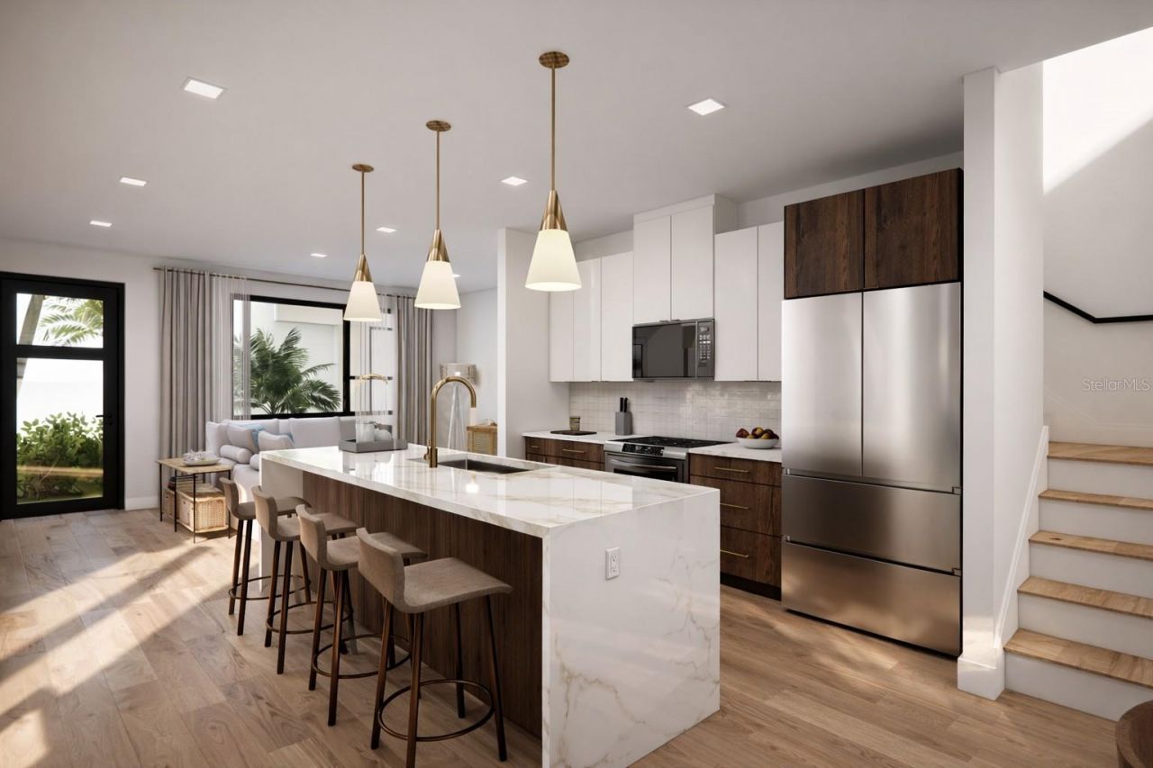 Under Construction. NEW year, NEW home! Welcome to Junction Townhomes - Discover modern luxury and contemporary elegance in the heart of vibrant Central Oak, St. Petersburg. With no detail overlooked, this thoughtfully designed two-bedroom townhome features open layouts, expansive impact resistant windows, and high-end finishes that blend style, comfort, and natural light. Inspired by Florida's tropical beauty, the Coastal Canopy design palette showcases rich wood grains, soft neutrals, and organic textures to create a warm, timeless retreat. The first floor welcomes you with a grand entryway leading into a spacious living room, dining area, and a beautifully designed custom kitchen featuring sleek European-inspired cabinetry, quartz countertops, a waterfall island, stainless steel appliances, and champagne-bronze fixtures. This open living space is ideal for both relaxation and stylish entertaining. Upstairs, you will find high ceilings (11 1/2 ft), two bedrooms and two bathrooms. The large primary suite features a generously sized walk-in closet and an elegant en-suite bathroom showcasing designer tile, champagne-bronze fixtures, and a double undermount vanity. Nestled among charming brick streets, historic Craftsman homes, and mature oak trees, Junction Townhomes are ideally located on the SunRunner rapid transit line-offering easy access to both downtown and the beach. Built in a NON-FLOOD zone with block construction, these homes offer the perfect blend of durability, beauty, and lifestyle convenience. Floor plans are for illustration and general information only and final design enhancements and construction detail may differ. Buyers are responsible for verifying all information to their satisfaction, each unit comes with one assigned parking spot. Construction completion anticipated early Spring 2026.