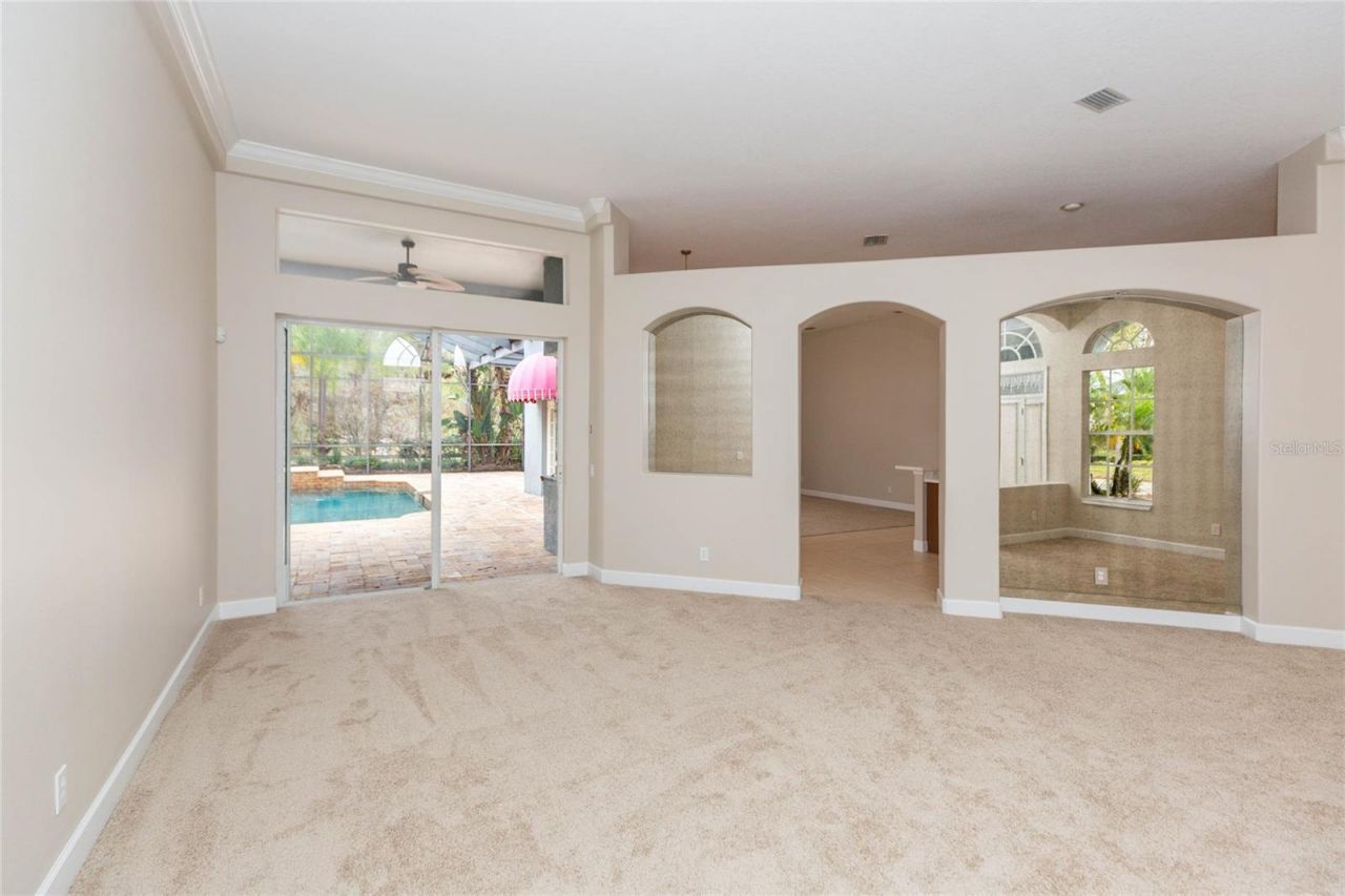 This impressive 4 bedroom, 4 bathroom pool home offers expansive living spaces, refined architectural detail, and a layout designed for both everyday comfort and elevated entertaining, complete with a private upstairs loft suite. Situated in the desirable 34638 area of Land O Lakes, the property enjoys convenient access to top rated schools, shopping, dining, and major commuter routes including the Suncoast Parkway, providing an easy drive to Tampa while maintaining a peaceful residential setting. From the moment you arrive, arched elevations, mature landscaping, and a covered entry create a distinguished presence. Inside, soaring ceilings, crown molding, fresh interior paint, and brand new carpet enhance the home's polished feel. The open and flowing floor plan features multiple gathering areas filled with natural light, while large sliding glass doors create seamless indoor and outdoor living with direct views of the pool and lanai. The kitchen is well appointed with rich wood cabinetry, stainless steel appliances, generous counter space, and a built in desk area, all opening naturally into the main living spaces. A custom library or executive office with floor to ceiling wood shelving adds warmth, sophistication, and versatility. The spacious primary suite offers comfort and privacy with its well designed bath, secondary bedrooms are generously sized, and a dedicated pool bath provides convenience for guests and entertaining. Upstairs, the oversized loft with a private full bath offers flexibility as a guest suite, media lounge, or private retreat. Outdoors, the home truly shines with a screened enclosure, expansive travertine paver terrace, and an impressive 20 by 26 pool with a dramatic 9 foot deep end and spa, creating a private setting ideal for relaxation or hosting on a larger scale. This residence delivers space, architectural character, and the kind of Florida indoor and outdoor lifestyle that stands out.