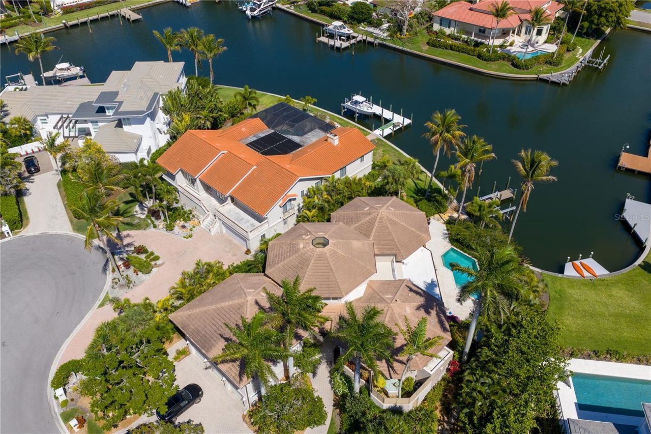 An extraordinary Contemporary Architectural estate - now offered with a $500,000 price reduction, presenting one of the most compelling waterfront opportunities on Longboat Key.Defined by its rare three-pod circular design, this sculptural residence is a dramatic composition of flowing living spaces connected by custom corridors - delivering exceptional privacy, abundant natural light, and seamless indoor-outdoor living.The Great Room pod features soaring wood-paneled ceilings and walls of glass framing tranquil water views.The circular primary suite offers a spa-level bath with dual showers, private office, lounge area, and direct pool access.The striking circular kitchen showcases a curved island beneath a two-story ceiling and skylight, with a radial appliance layout that is both artful and highly functional.Two en-suite guest bedrooms open to private patios, while a fully self-contained Secondary Primary Suite above the 32' x 23' three-car garage includes independent HVAC, a luxury bath with Steam Shower and Sauna, a flexible living space ideal for extended guests.Outdoors, enjoy protected deep sailboat water, a private dock with 12,000-lb lift, and a resort-style pool and spa.Situated behind the 24-hour gates of Bay Isles, with exclusive access to the Bay Isles Beach Club on the Gulf of Mexico.