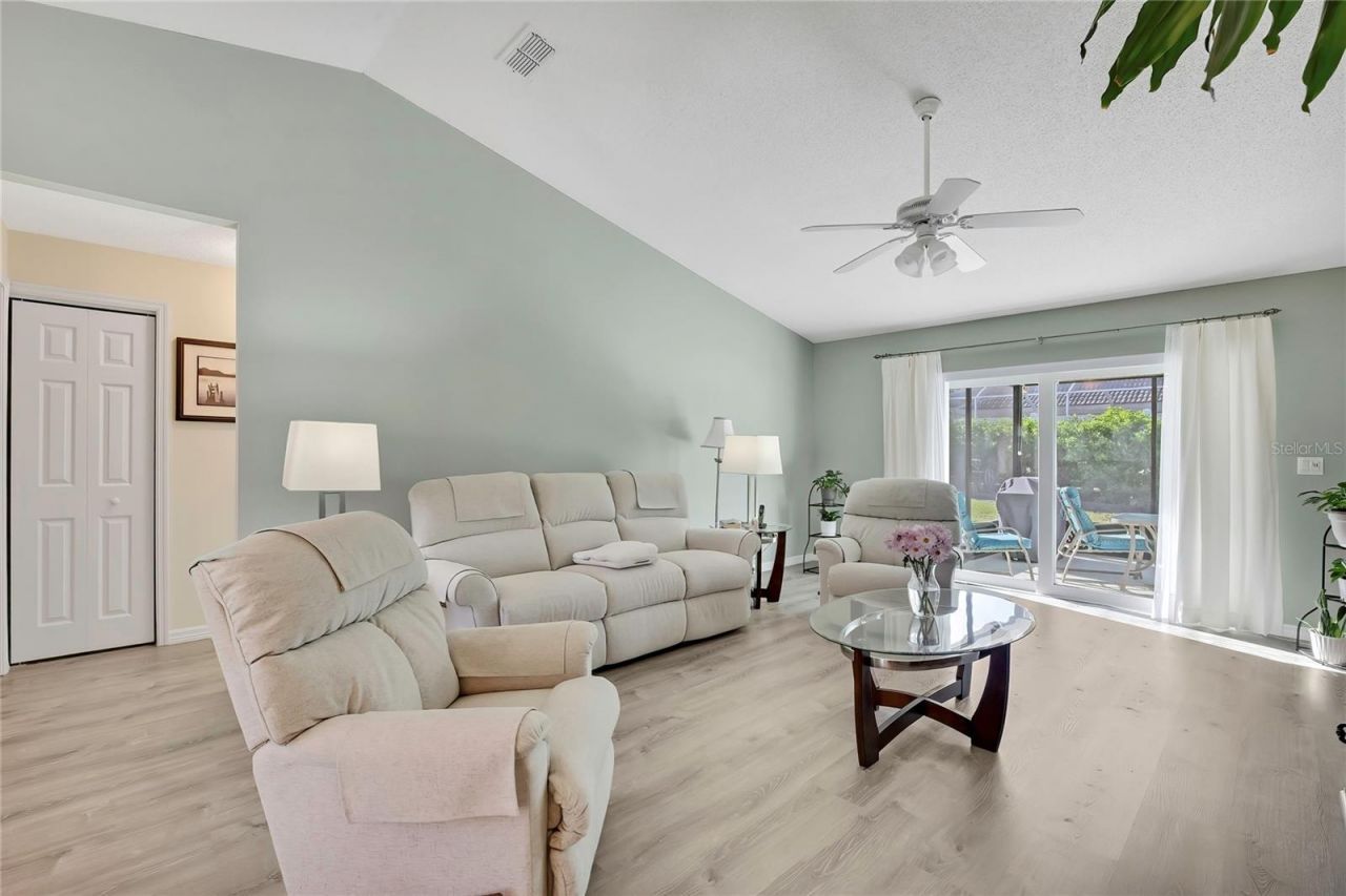 This beautifully maintained 3-bedroom, 2-bath, 2-car garage home shows like a model! Featuring a spacious 12x21 screened porch and a vinyl white fenced backyard, this home offers both privacy and outdoor living at its finest. Inside, you'll find luxury waterproof vinyl flooring and vaulted ceilings throughout, creating an open and airy feel. A double-door entry welcomes you in, while the exterior features clean, low-maintenance landscaping with decorative rock beds, curbed borders, and thoughtfully placed greenery for excellent curb appeal. Major updates include a new roof (2018), HVAC (2017), water heater (2019), exterior paint (2021), irrigation well (2000), water softener (2025), and whole-house hurricane impact windows and sliders (2025). The home also includes an in-wall pest system for added convenience and peace of mind. Residents enjoy access to a clubhouse and community pool. This home truly has it all!
