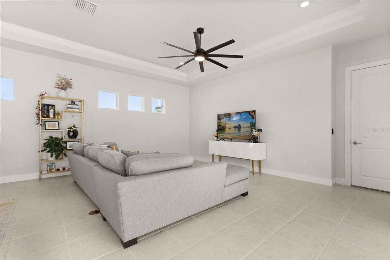 **This property qualifies for a closing cost credit up to $12,000 through the Seller's preferred lender (restrictions apply).** Welcome to a beautifully designed 4-bedroom, 3.5-bathroom single-family home that blends elegance, comfort, and modern living. Located in the sought-after community of Epperson Wesley Chapel, this residence offers impressive curb appeal with a manicured front yard, a paver driveway, and a 2-car garage. A beautiful stone fa?ade frames the arched passthrough leading to French wood-framed glass doors, setting a warm and inviting tone.Step through into your private lanai, where a sparkling pool awaits-surrounded by a spacious paver patio, perfect for relaxing or entertaining.The patio is also plumbed and ready for a custom outdoor kitchen, making it an entertainer's dream. Inside, the open-concept layout seamlessly connects the kitchen, dining, and living areas. The living room is anchored by a sleek black modern ceiling fan and a large four-pane sliding glass door offering a stunning view of the pool area. Modern square accent windows adorn the wall above the dining space, adding natural light and architectural interest. The chef's kitchen is upgraded throughout and features a striking white waterfall stone island with breakfast bar seating, modern pendant lighting, stainless steel appliances, a sleek cooktop with a matching range hood, built-in oven, pristine white cabinetry, and an upgraded backsplash that adds a stylish, polished finish. Adjacent is a well-equipped laundry room with a bottom-loading washer and dryer, plus built-in shelving for convenience. Down the hall, two carpeted bedrooms with built-in closets and stylish black ceiling fans share a thoughtfully designed Jack-and-Jill bathroom with dual vanities and a tub, all tied together with the same upscale cabinetry from the kitchen. A nearby half bath offers additional comfort for guests. The spacious carpeted primary suite is a true retreat, boasting tray ceilings, signature square windows, and a triple-pane sliding door that opens directly to the pool and patio area. The ensuite bathroom includes dual sinks, a large mirror, matching cabinetry, and a luxurious glass-enclosed, oversized tile shower with an overhead rainfall shower head. All bathrooms in the home have been thoughtfully upgraded for a modern, high-end feel. The fourth bedroom serves as a private in-law suite located at the front of the home-offering privacy and versatility with its own full bathroom, making it ideal for extended family, guests, or a home office setup. Step outside to the covered patio, ideal for outdoor lounging or dining. The serene pool includes a small waterfall feature and is fenced for added privacy. Beyond the pool, a fully fenced blank canvas backyard invites your imagination-perfect for a garden, play space, or custom outdoor oasis. Don't miss your chance to own this move-in-ready gem that perfectly balances style and functionality in a thriving location! ** Furniture negotiable**